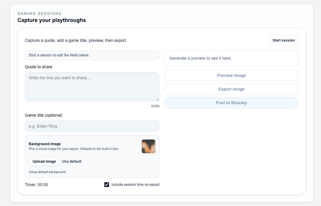 Interactive web app with (1) ability to draft notes, (2) running game sessions, and (3) exportable share cards.